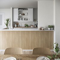 壁紙を貼り替えるだけで、キッチンは見違えるほど明るく清潔な印象に。